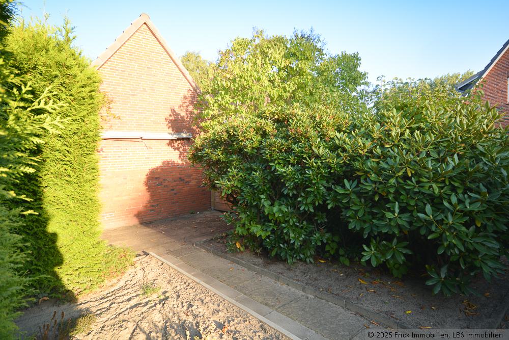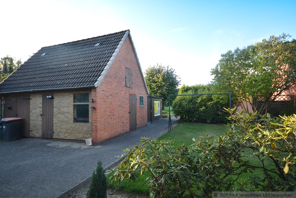 Die gepflasterte Auffahrt führt vorbei am Wohnhaus bis vor das Nebengebäude. Hierin liegt eine Garage (mit Stufenversatz) und weitere Abstellräume / Lagerräume.