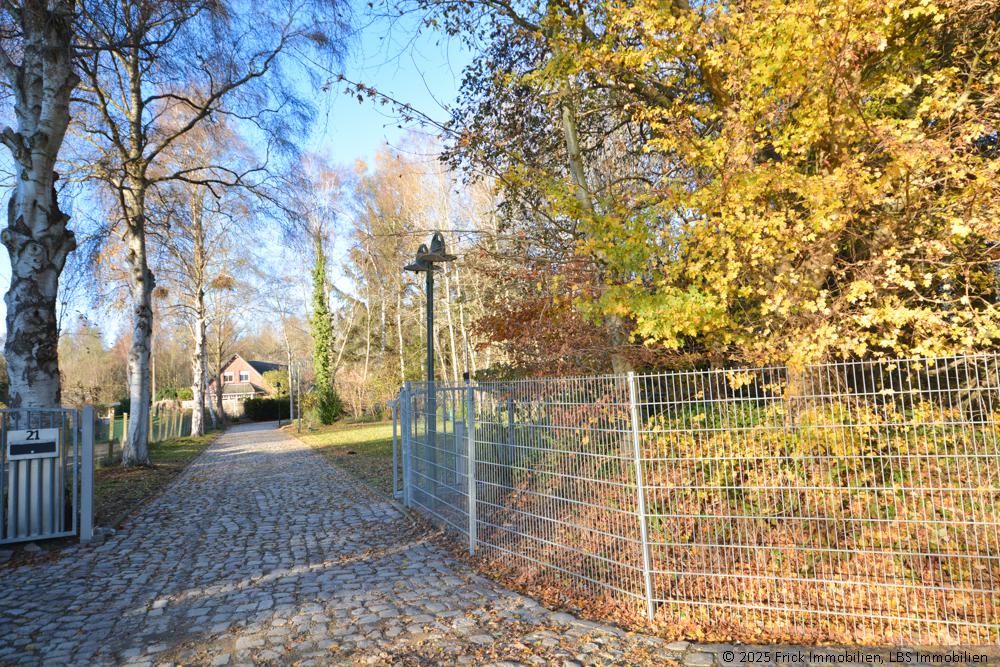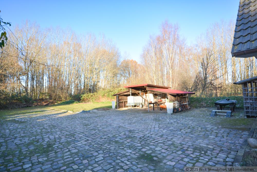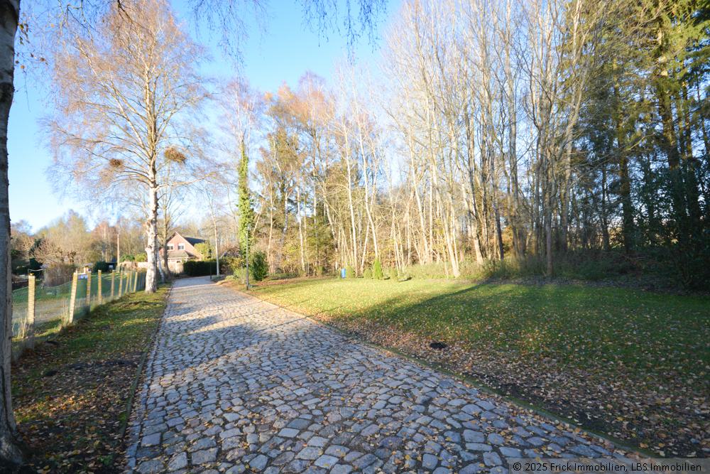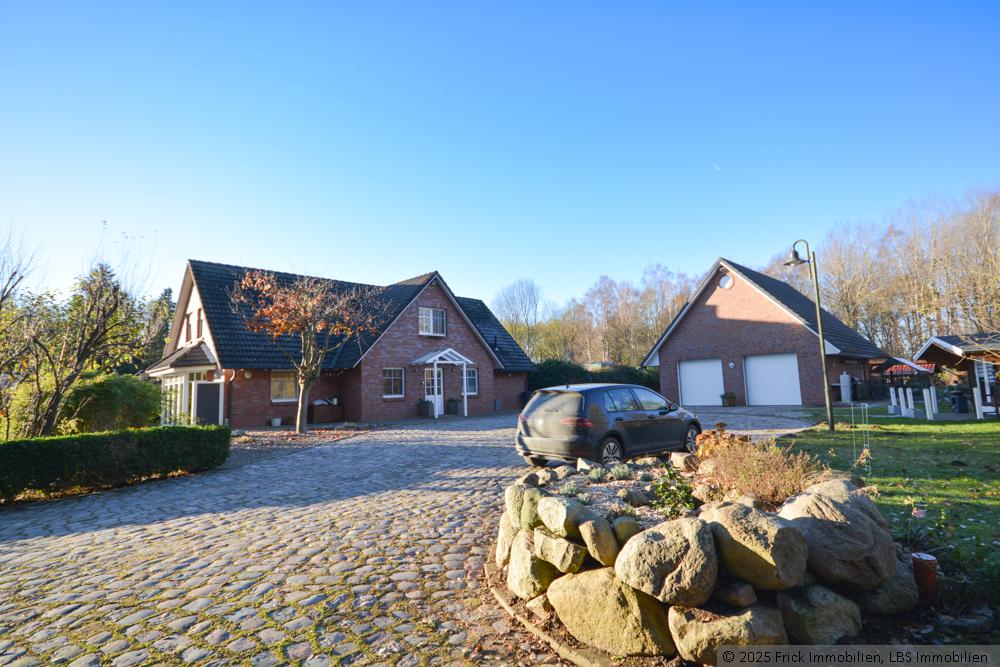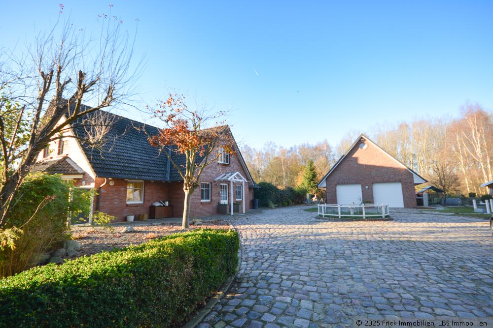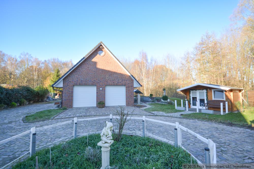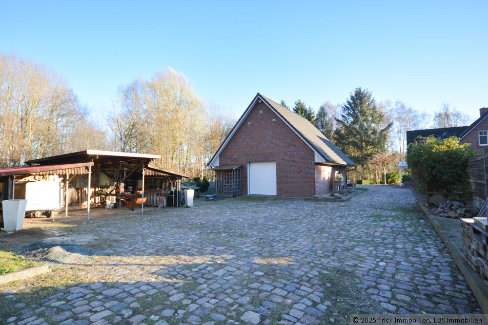 Die Zufahrt zum Haus ist aus klassischem Kopfsteinpflaster angelegt und verfügt über ein Rondell direkt vorm Haus bzw. vor der großen Garage. Neben der Garage befindet sich das Gartenhaus, hinter der Garage gibt es einen großen Unterstand. Die gesamte Zufahrt, sowie der Wendeplatz und der Hof um die Garage sind gepflastert und bieten noch weitere Parkplätze.