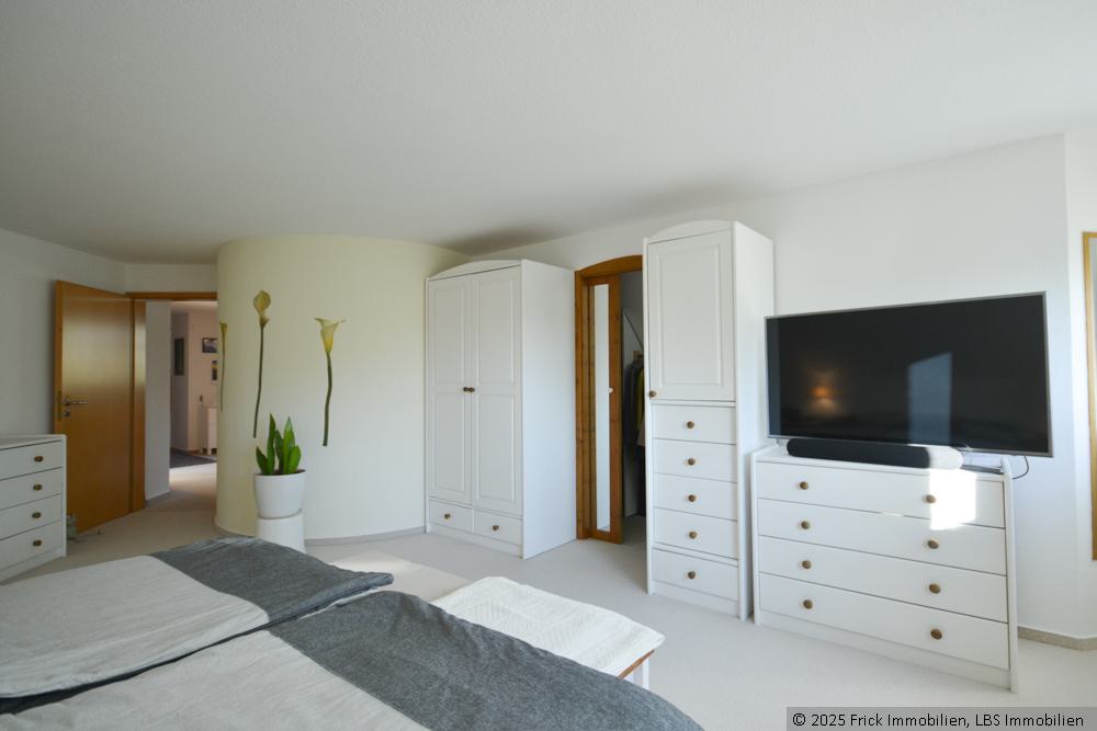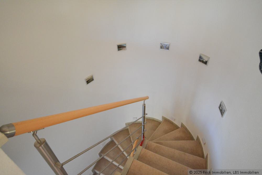 Die besondere Treppe vom Erdgeschoss ins Dachgeschoss wurde als Rundtreppe aufwendig und individuell gemauert, sodass die Rundung auch im Wohnzimmer des Erdgeschosses und im Schlafzimmer des Dachgeschosses sichtbar ist.
