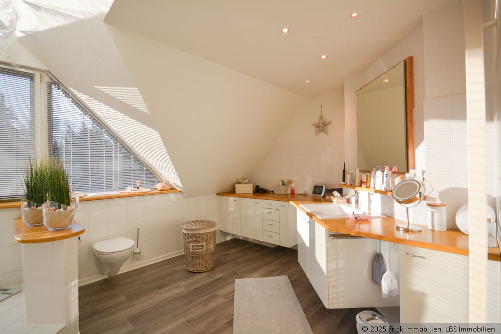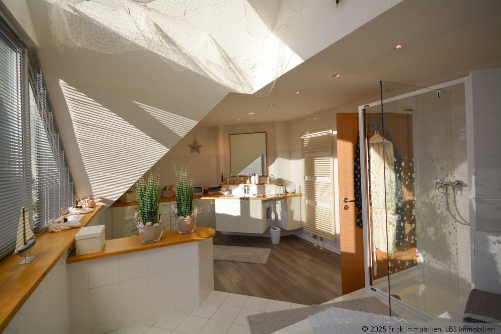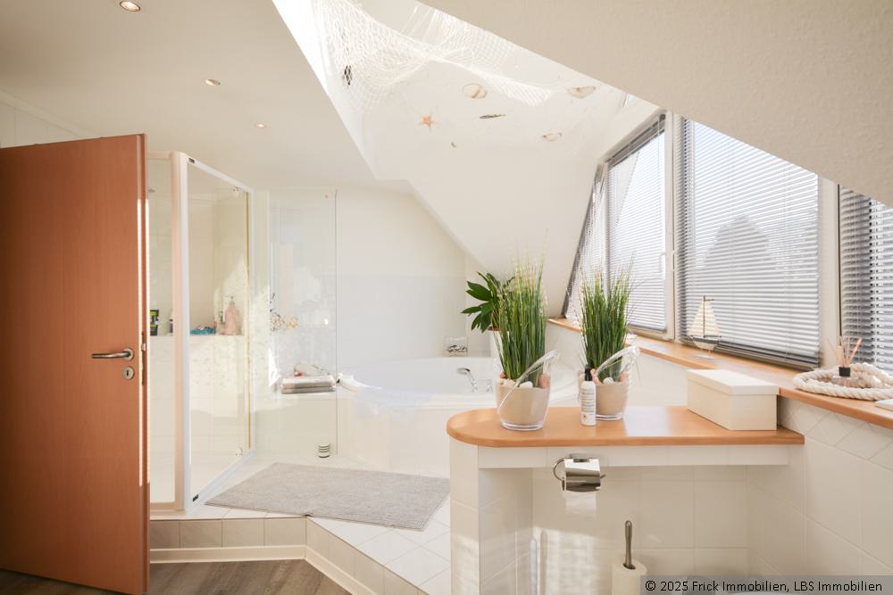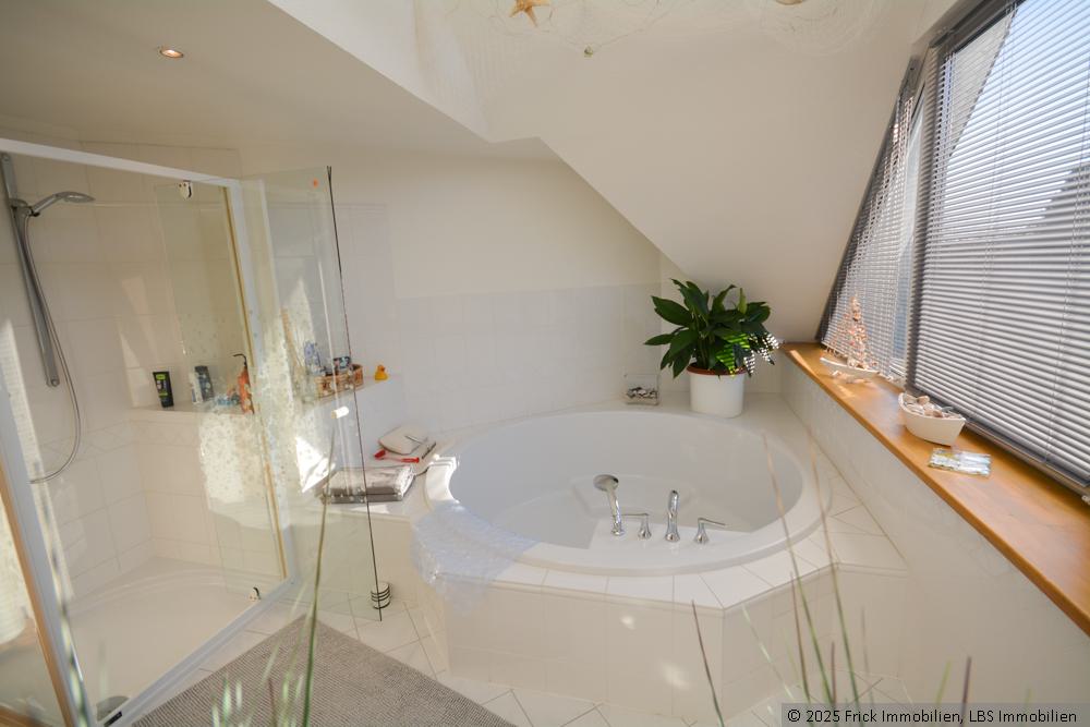 Das große Bad verfügt über eine große Rundbadewanne, Dusche, hängendes WC, einen Waschtisch, Handtuchtrockner und eine große Gaube mit Außenfenstern.
