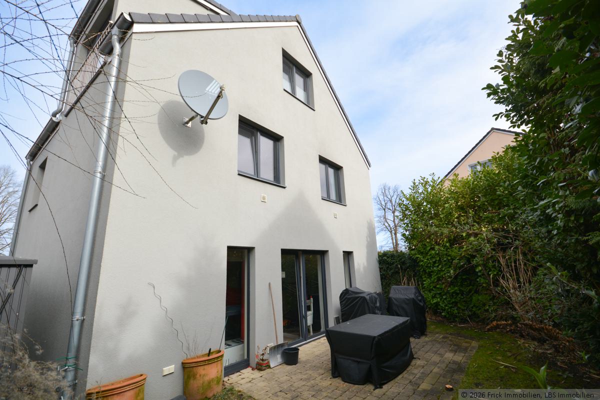 Vor dem großzügigen Wohn- und Essbereich liegt die gepflasterte Terrasse. Neben dem Haus ist Platz für einen Gartengeräteschuppen und Fahrräder etc.