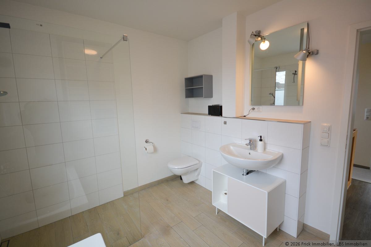 Das Badezimmer im Obergeschoss ist ebenfalls mit einem gehängten WC, einem Waschbecken, einer Badewanne und einer ebenerdigen Dusche mit fester Glastrennwand versehen.